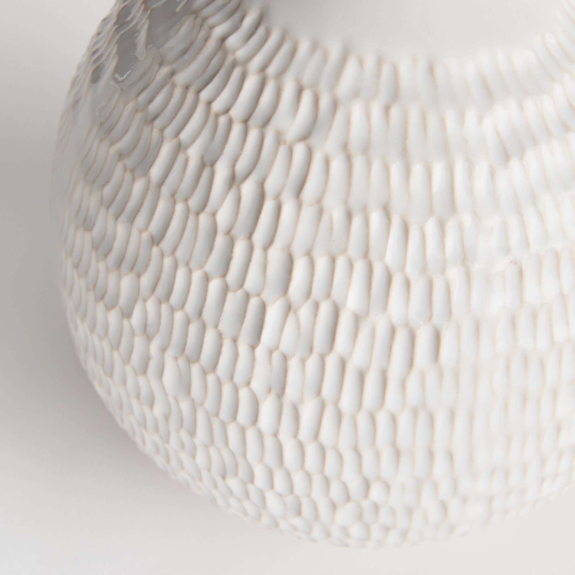 Handcrafted from stoneware, this white ceramic vase embodies artisanal tradition through its textured surface and refined proportions. The etched detailing evokes time-honored pottery techniques, while the soft glaze and compact silhouette create understated sophistication. Its narrow opening suits single stems or sculptural display, making it equally at home on a shelf or as a standalone accent. The neutral palette complements French country, coastal, and cottagecore aesthetics with authentic, tactile warmth. Each piece varies slightly, honoring the handmade nature of true artisan work. A thoughtful choice for those who value craftsmanship and curated, soulful interiors.