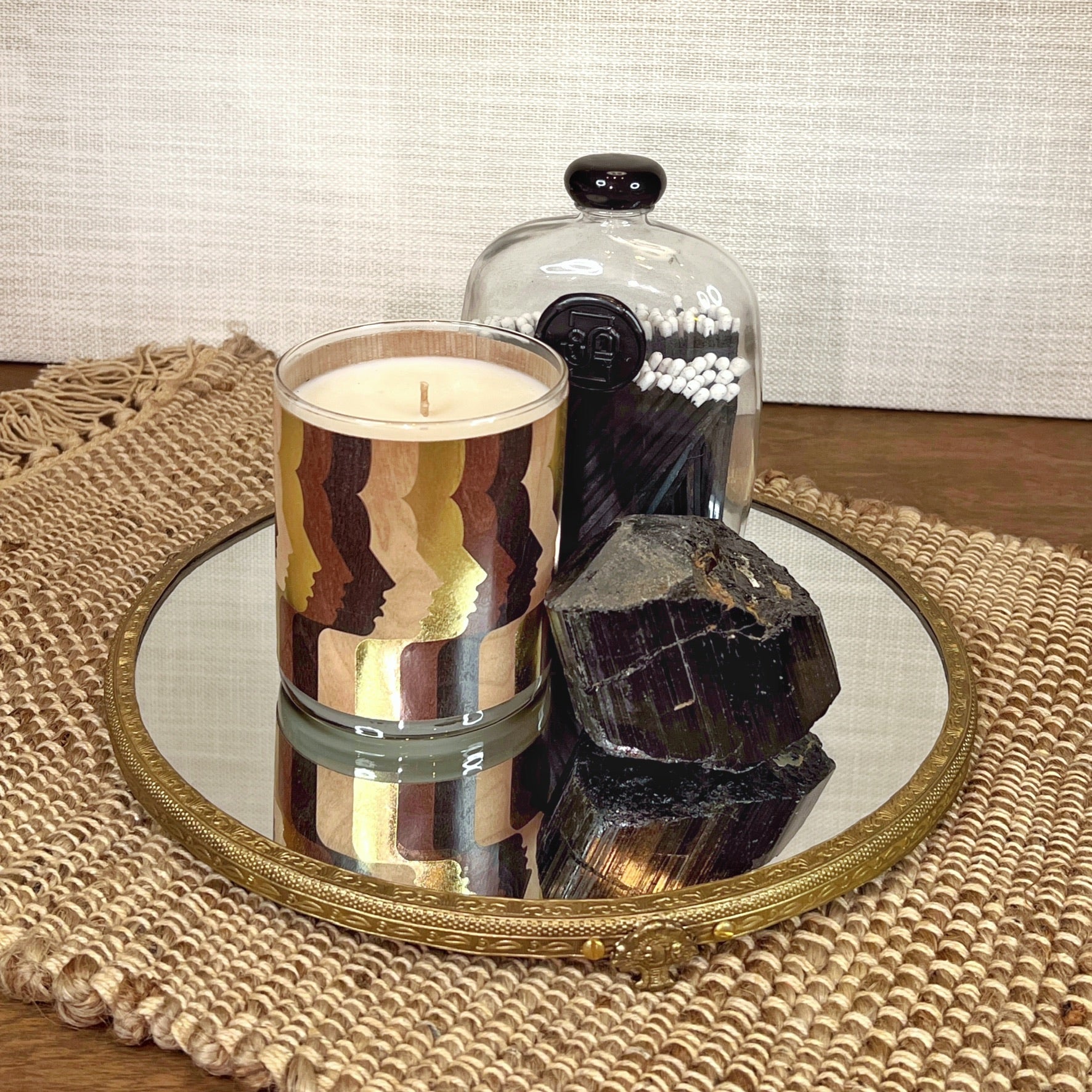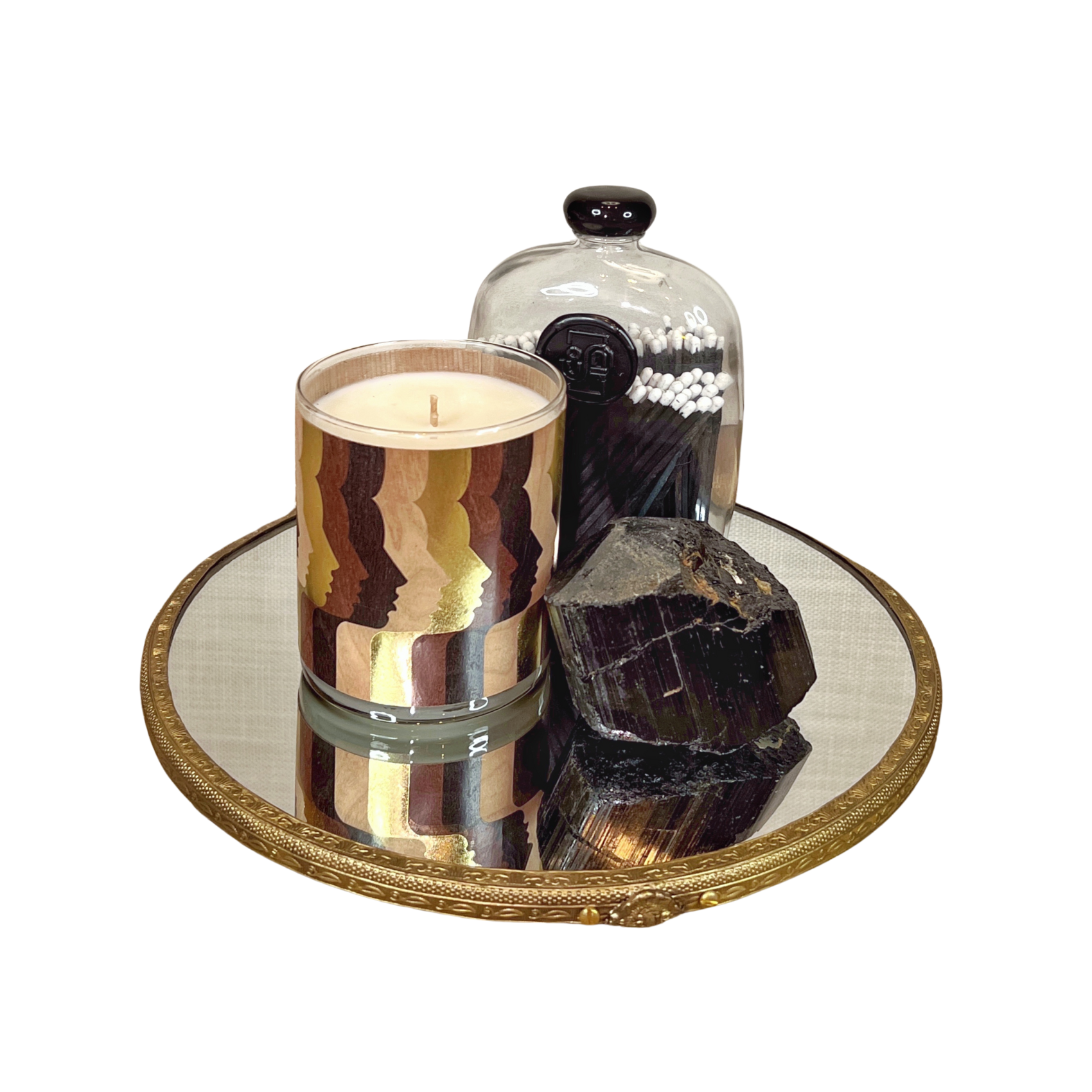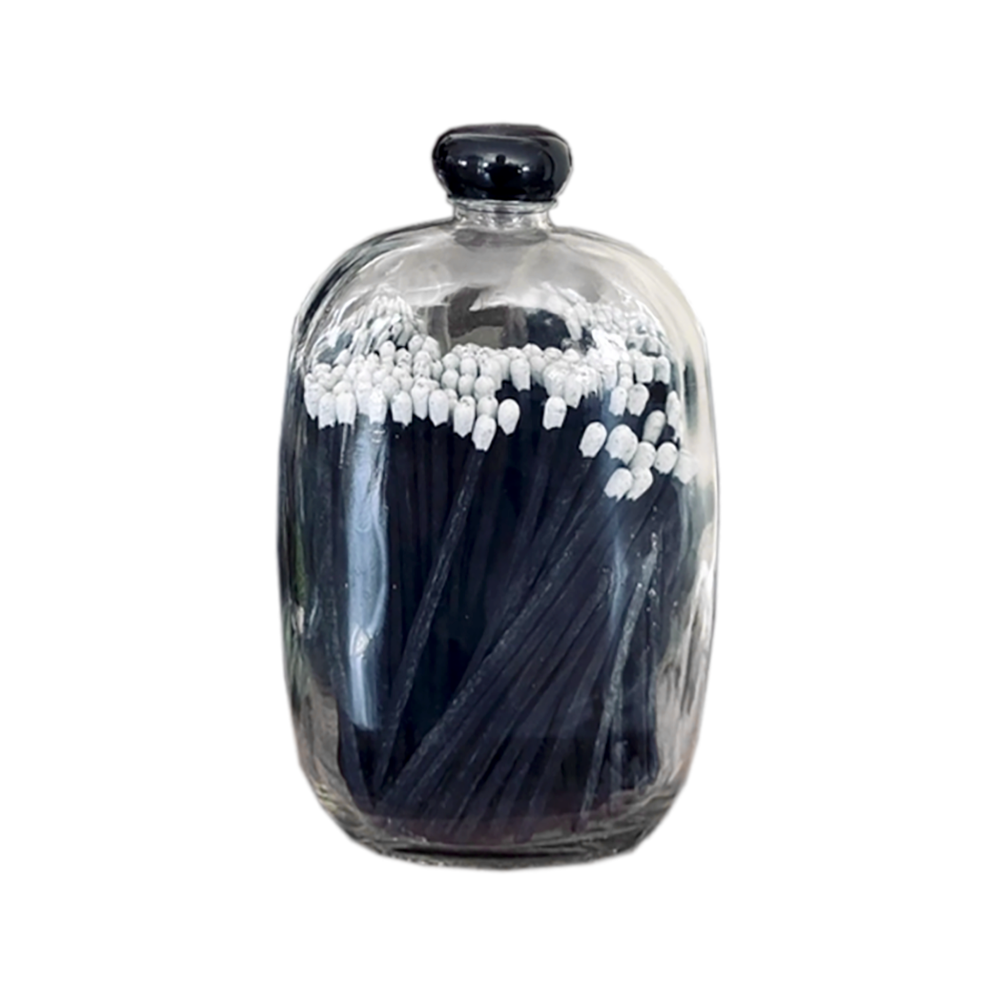 A refined accent for the discerning home. This artfully designed match collection pairs approximately 120 black match sticks with white tips in a graceful glass decanter, complete with a removable screw-top lid for easy access and display. Each match features a reliable strike surface, making this both a functional essential and a curated décor element. The minimalist vessel elevates any shelf or mantelscape with quiet sophistication. Dimensions: 4" W x 1.8" D x 6.3" H.