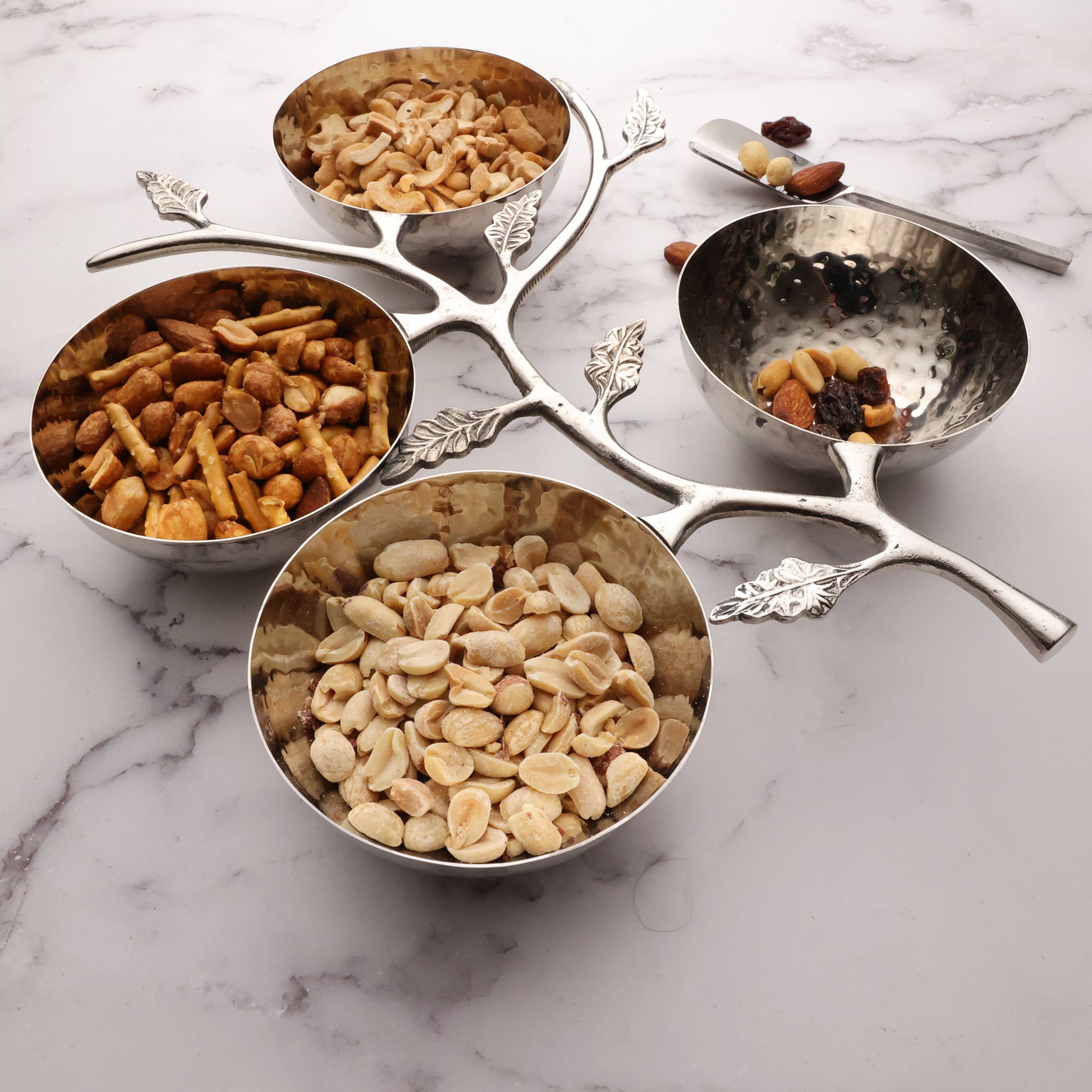 Inspired by nature's delicate architecture, this Hammered Leaf Nut Bowl merges artisanal craftsmanship with refined functionality. Four hand-hammered stainless steel vessels nestle gracefully along a sculptural silver vine, creating an organic yet polished centerpiece. Crafted from premium 18/8 stainless steel, it transitions effortlessly from serving dips and condiments to displaying confections and nuts. The intricate hammered texture and leaf motif evoke timeless elegance, while its dishwasher-safe construction ensures practical everyday use. A sophisticated accent for dining tables, kitchen counters, or living spaces—and a thoughtful gift for those who value distinctive design and quality craftsmanship.
