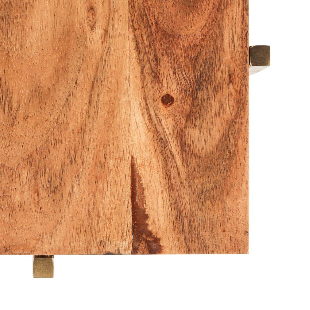This refined accent table brings understated elegance to any room with its natural acacia wood surface and polished gold metal framework. The compact 10" square design and 24" height make it an ideal fit for intimate spaces, from beside a sofa to a bedroom corner. The distinctive wood grain provides organic warmth while maintaining a contemporary aesthetic. Durable construction ensures lasting beauty—simply dust regularly with a soft cloth and use protective coasters to maintain its pristine finish. A versatile statement piece that balances form and function effortlessly.
