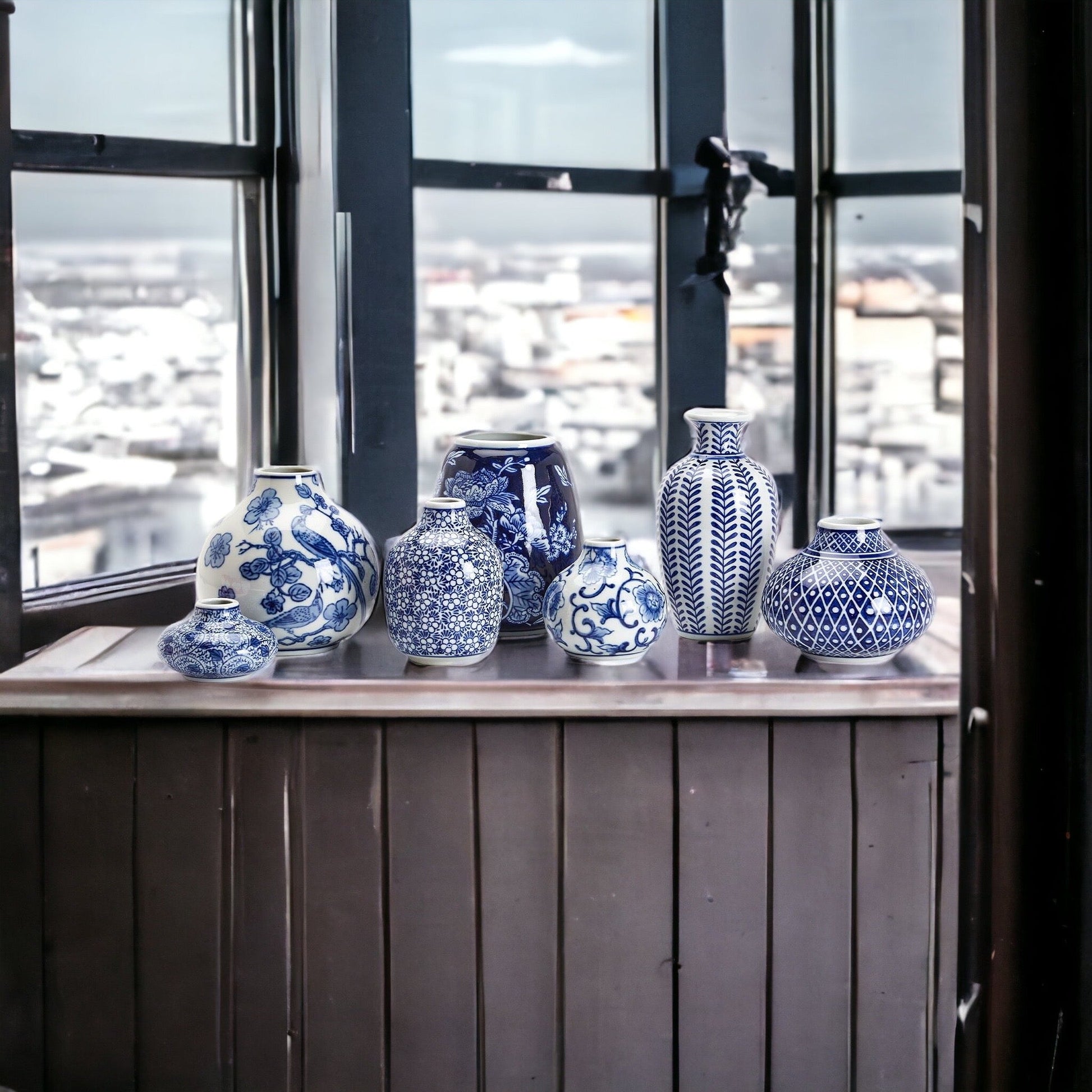 Hand-painted porcelain vases in classic blue and white, inspired by timeless Chinoiserie design. Each piece features distinctive artisanal detailing and arrives in one of seven curated styles, ranging from 2.5" to 8" in height. Versatile enough to showcase fresh or faux florals, serve as striking centerpieces, or stand alone as sculptural home accents. The generous proportions and refined stoneware construction make these vases equally suited to plant display or purely decorative arrangements. Available individually or as a complete seven-piece collection for a cohesive, gallery-worthy aesthetic.