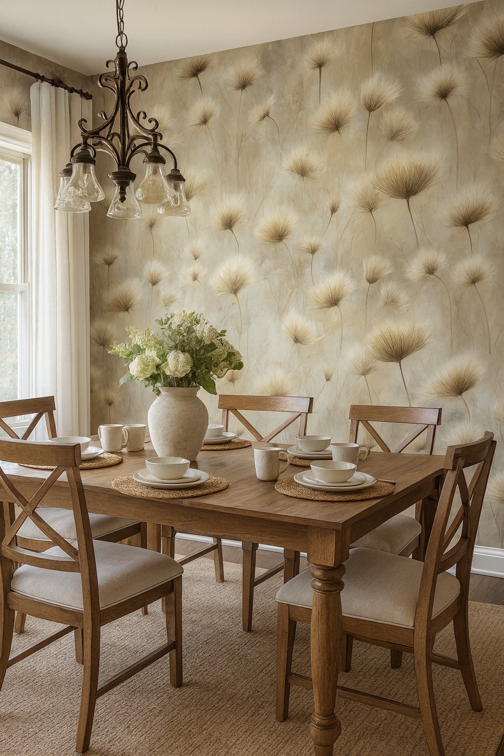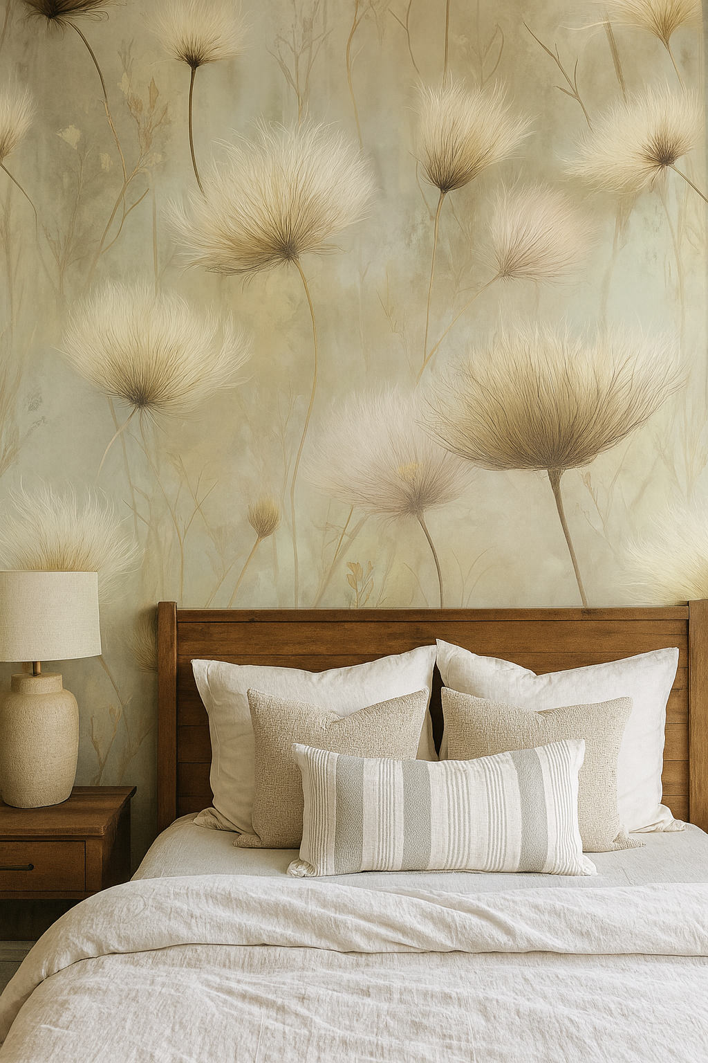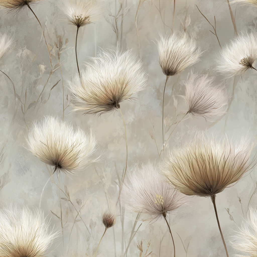 "Smoke Bloom Drift" wallpaper brings an enchanting botanical whisper to any room. Inspired by the delicate, feathery forms of Prairie Smoke flowers, this design captures nature's poetry in soft watercolor brushstrokes. Ivory, blush, and sand-toned blooms drift dreamily across a misty gray-beige canvas, while subtle stems and ghostlike foliage create layers of visual intrigue without overwhelming the senses. The playful yet serene aesthetic makes this wallpaper a versatile choice—equally at home in Scandinavian-inspired living spaces, whimsical nurseries, or romantic boudoirs seeking that perfect balance of artistic sophistication and gentle charm. The soft color palette soothes while the artistic rendering delights, transforming walls into a gallery of botanical dreams. With a 24" x 24" repeat pattern, installation is straightforward, allowing the design's flowing movement to create a cohesive, gallery-quality finish throughout your space. Whether you're reimagining a single accent wall or enveloping an entire room, this wallpaper delivers softness with undeniable artistic flair.