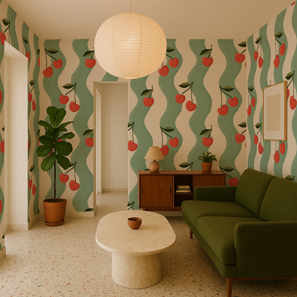 Brighten up your home with the Wavy Cherry Wallpaper in fresh white and teal, a playful design by Samantha Santana that adds a fun, fruity twist to any room. This lively pattern combines wavy lines with charming cherry motifs to create a cheerful, eye-catching look. Installation is simple and flexible—choose peel-and-stick for a quick, no-fuss update or go with the traditional pasted method for a classic finish. The wallpaper is also removable, making it perfect for those who love to refresh their decor often or renters looking for stylish, temporary wall art. Add a splash of personality and make your space stand out with this delightful wallpaper.